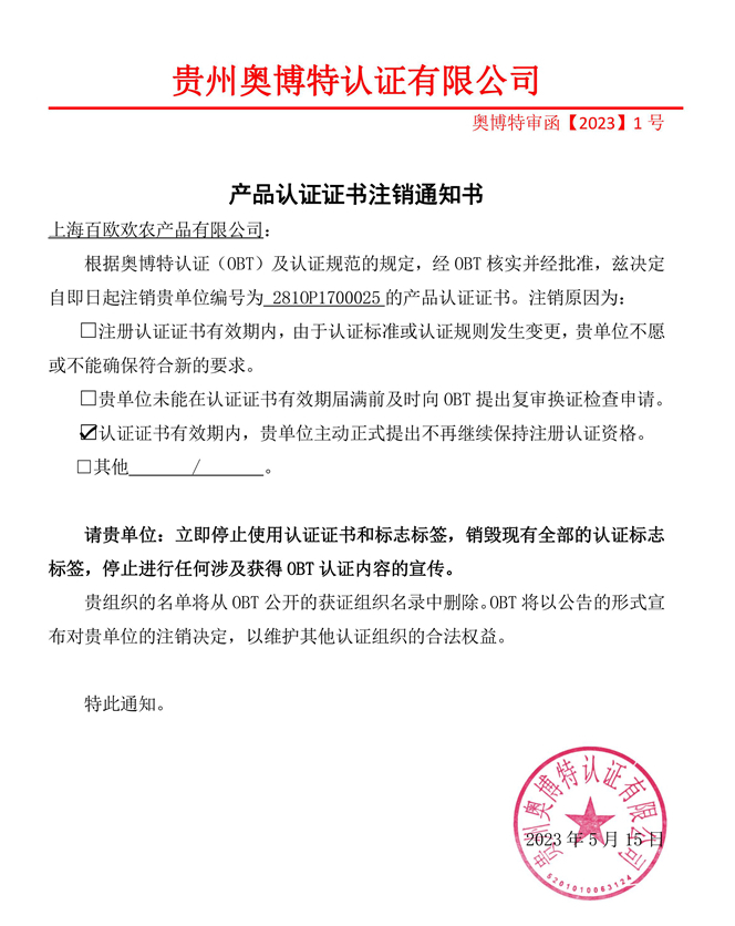 注銷上海百歐歡農(nóng)產(chǎn)品有限公司產(chǎn)品認(rèn)證證書通知