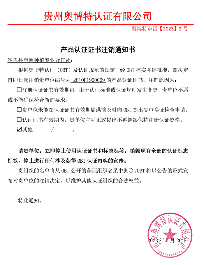 注銷岑鞏縣寶園種植專業(yè)合作社產(chǎn)品認(rèn)證證書通知