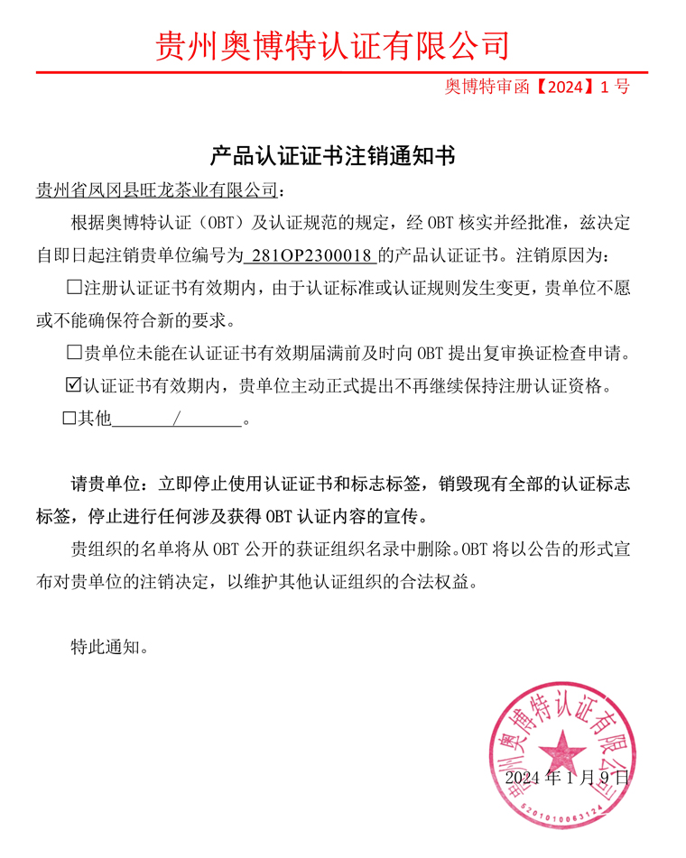 注銷貴州省鳳岡縣旺龍茶業(yè)有限公司產(chǎn)品認(rèn)證證書通知