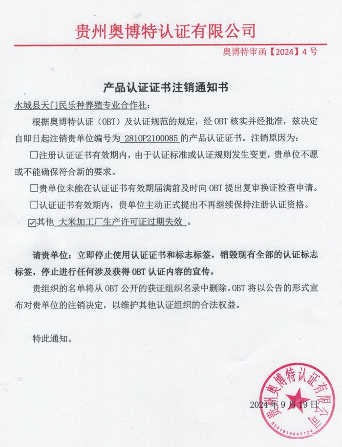 注銷水城縣天門民樂種養(yǎng)殖專業(yè)合作社產(chǎn)品認(rèn)證證書通知